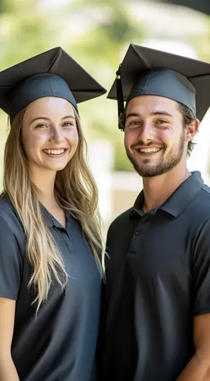 Zwei NOVOTERGUM Mitarbeiter in Absolventenmützen lächeln vor der Kamera