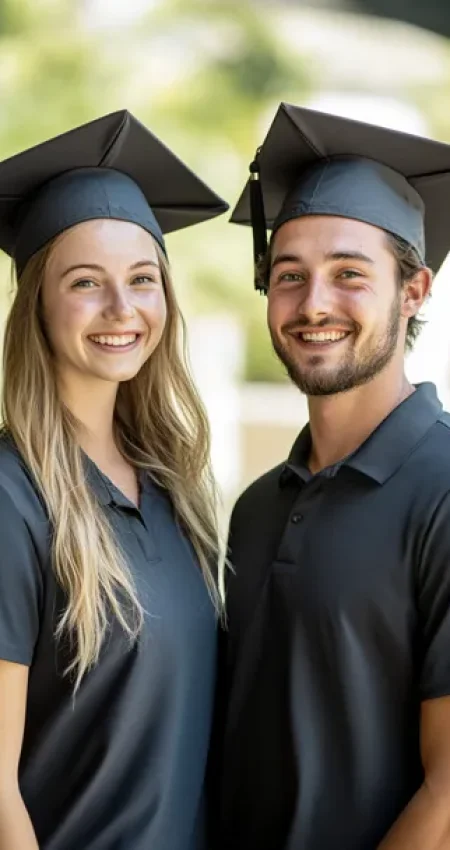 Zwei NOVOTERGUM Mitarbeiter in Absolventenmützen lächeln vor der Kamera
